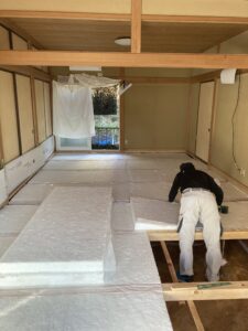 床組の間に合計135㎜厚の断熱材を敷き込みました。