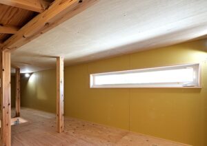 小屋裏収納にも明るいアクセントクロスで個性が光ります。