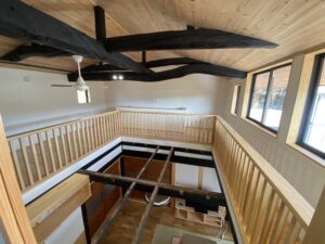 玄関は2期工事のため、居室の広縁から仮の踊り場と階段・手すりを設け、